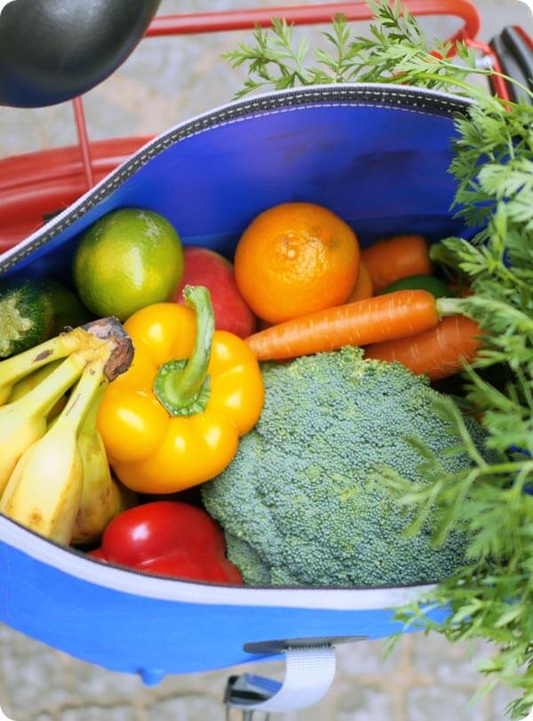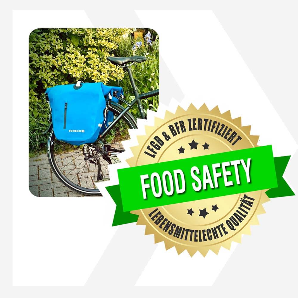 Finally, shop sustainably! Our bike bags for luggage racks are made from food-safe materials and certified according to the German Food Code (LFGB). This means that you can transport your fresh fruit and vegetables without any worries , odorless and free from plasticizers.