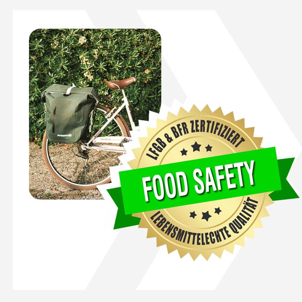 Finally, shop sustainably! Our bike bags for luggage racks are made from food-safe materials and certified according to the German Food Code (LFGB). This means that you can transport your fresh fruit and vegetables without any worries , odorless and free from plasticizers.