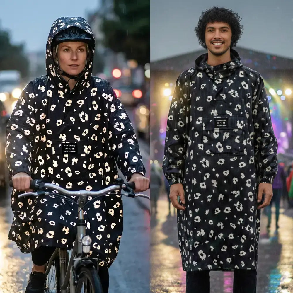 Mit seinem auffälligen silber reflektierendem Leo-Print auf schwarzem Grund ist dieser reflektierende Regenponcho ein echtes Design-Highlight, das dich sicher und stylisch durch den Stadtverkehr bringt.